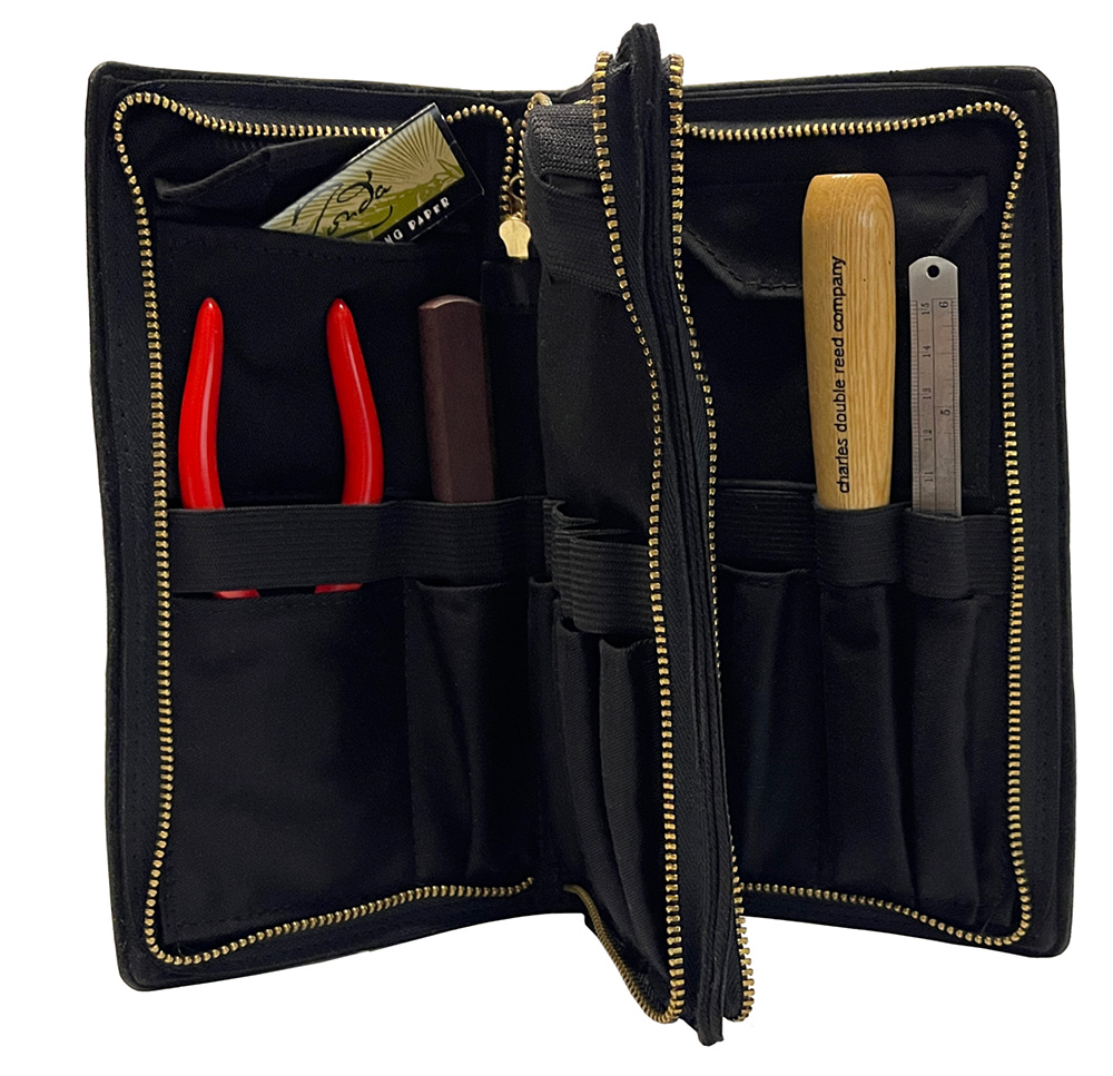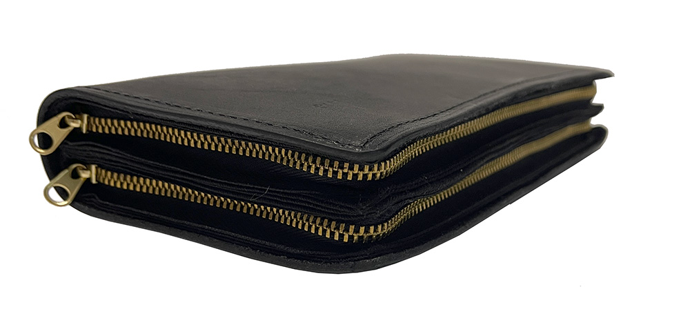 The brass zippers are substantial and high quality. This double-sized case offers twice the tool carrying capacity of the Wilson single leather tool case.