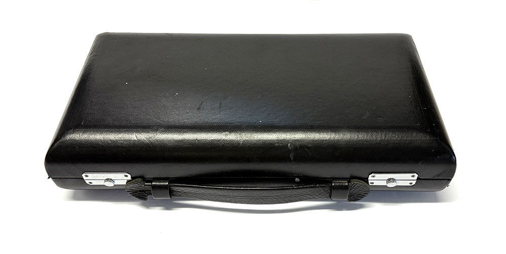 The original hard shell case is in serviceable condition with dents and bumps on the exterior.