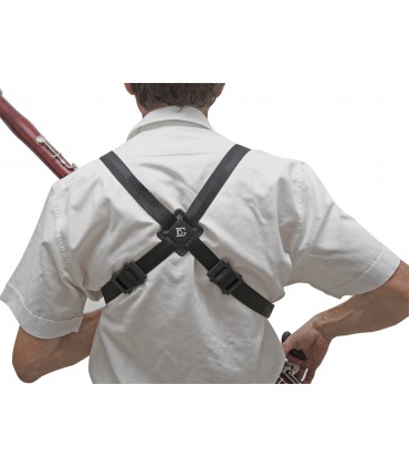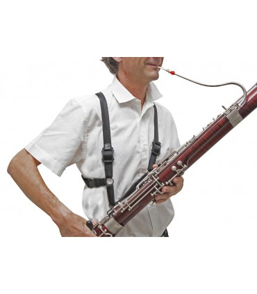 Your bassoon attaches to a hook slightly offset from the center on the adjustable, comfortable nylon web harness.