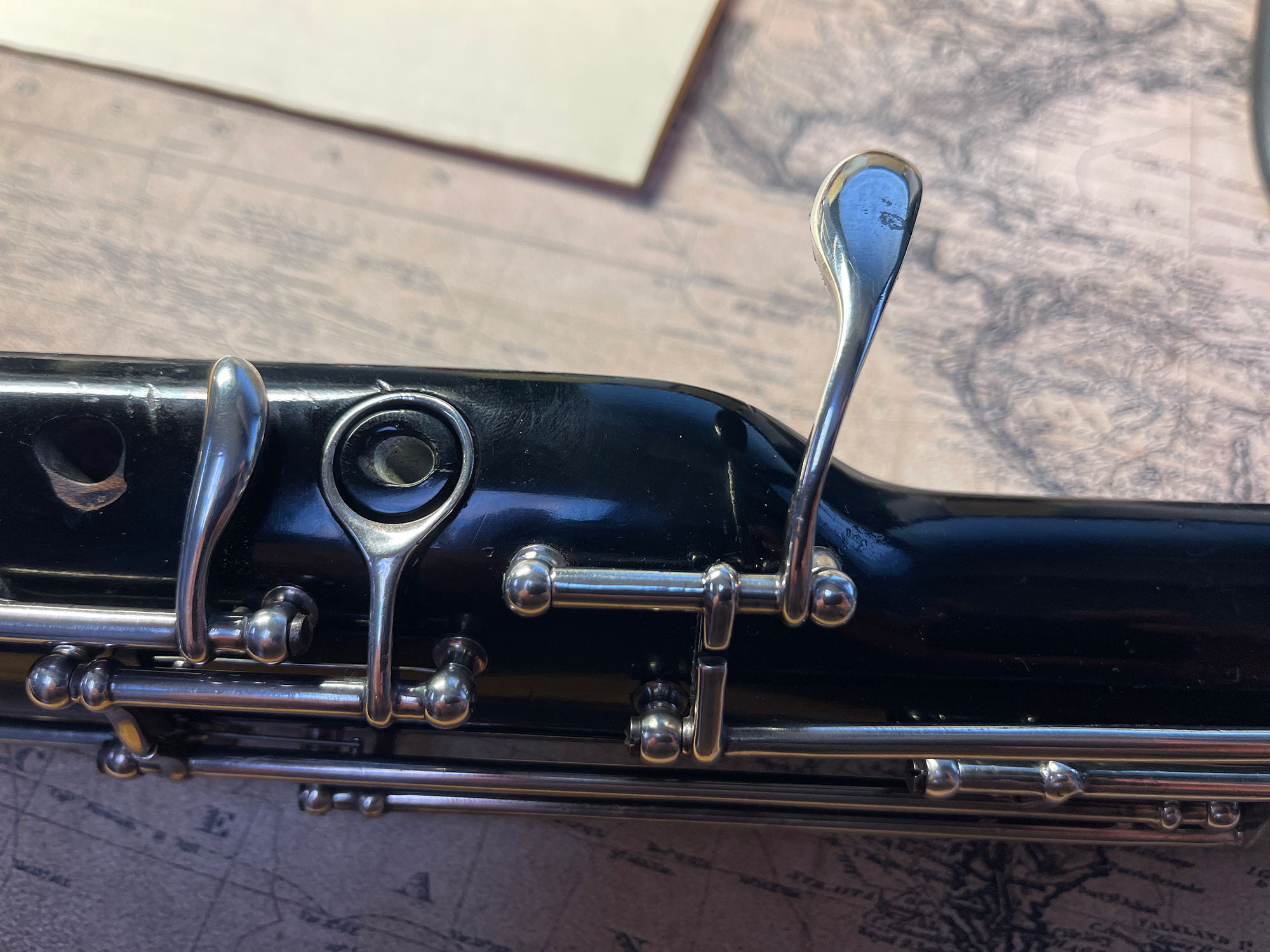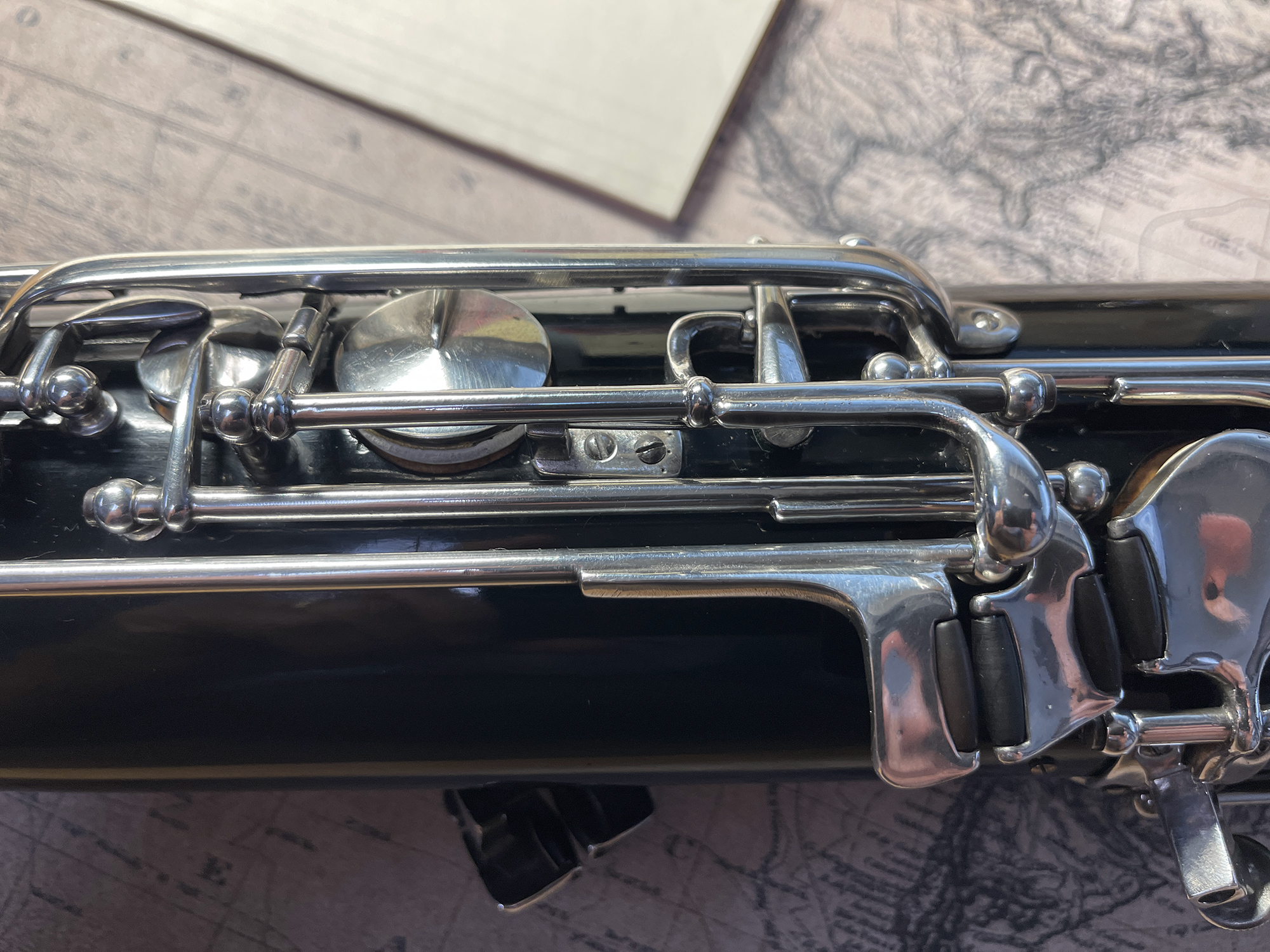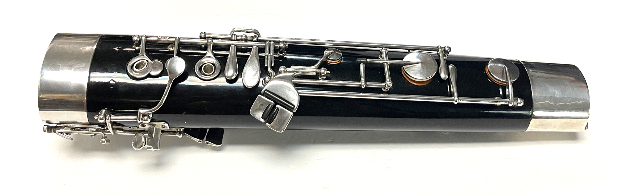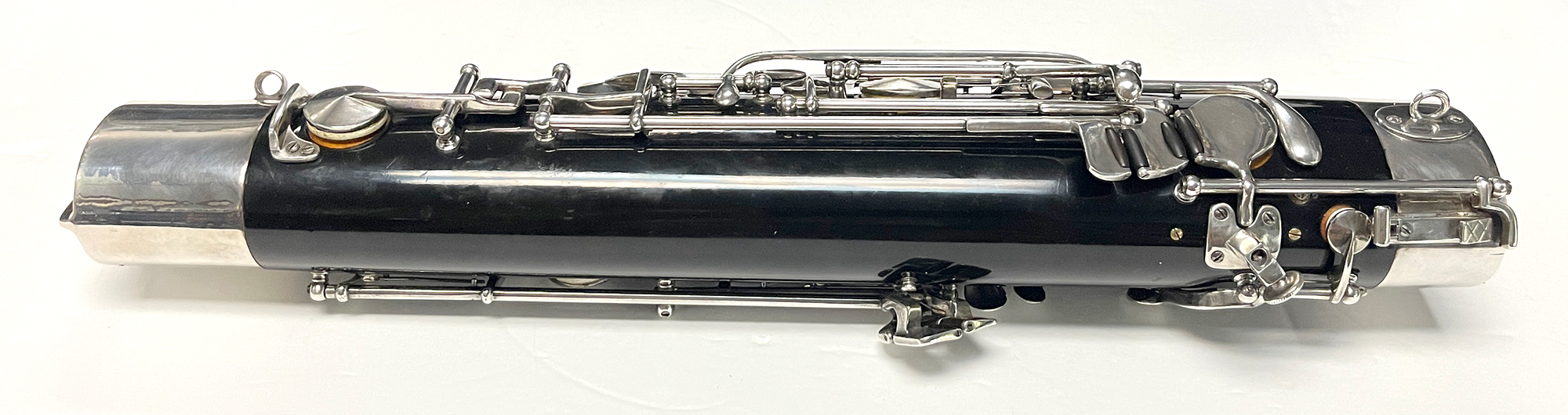 This instrument was cared for by Hans Moennig for many decades. It was Moennig who designed and created the custom additional keywork. The instrument was refinished in the original black finish and fully resilvered by James Laslie. The finish and silver keywork are in excellent condition.