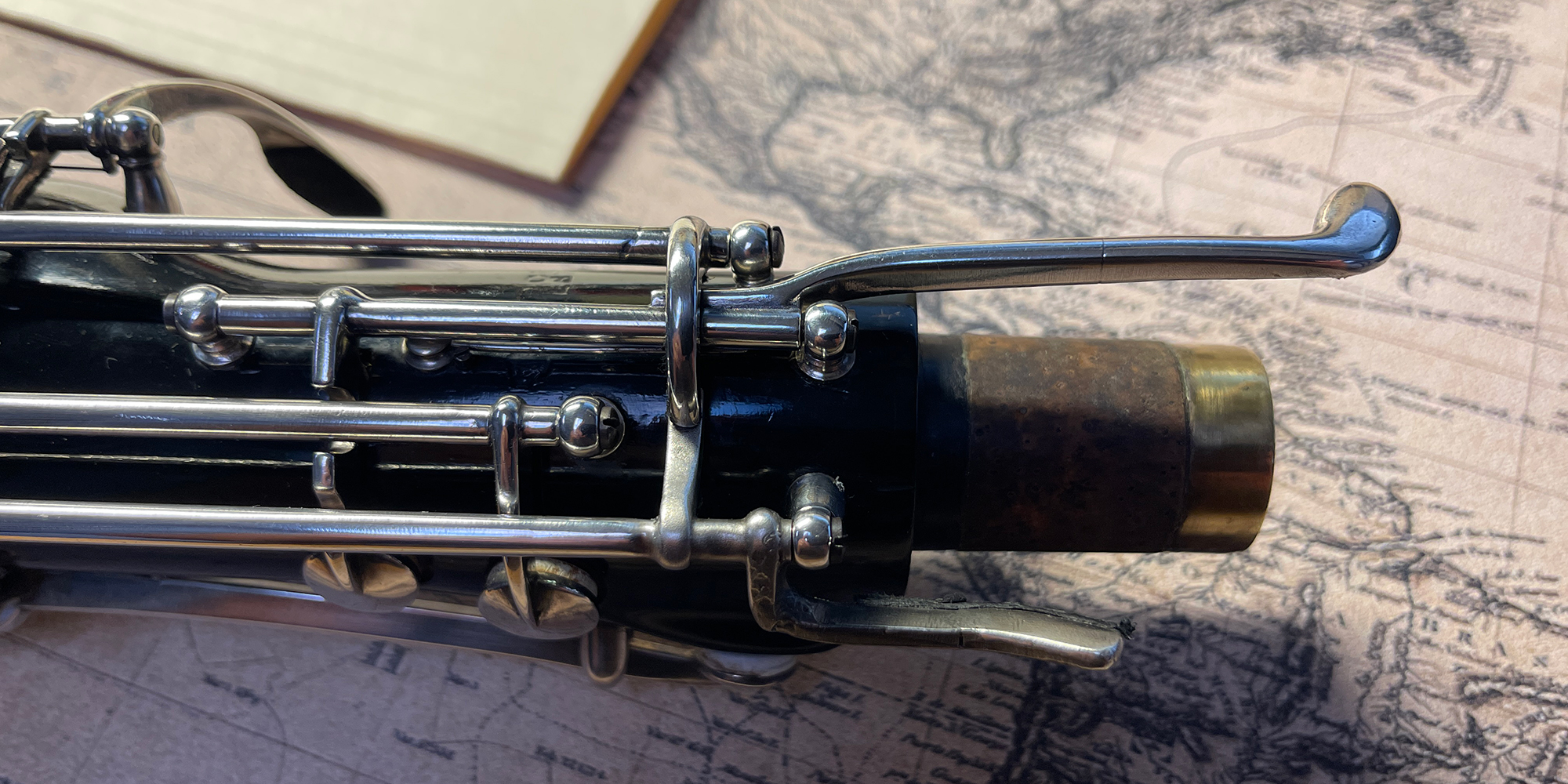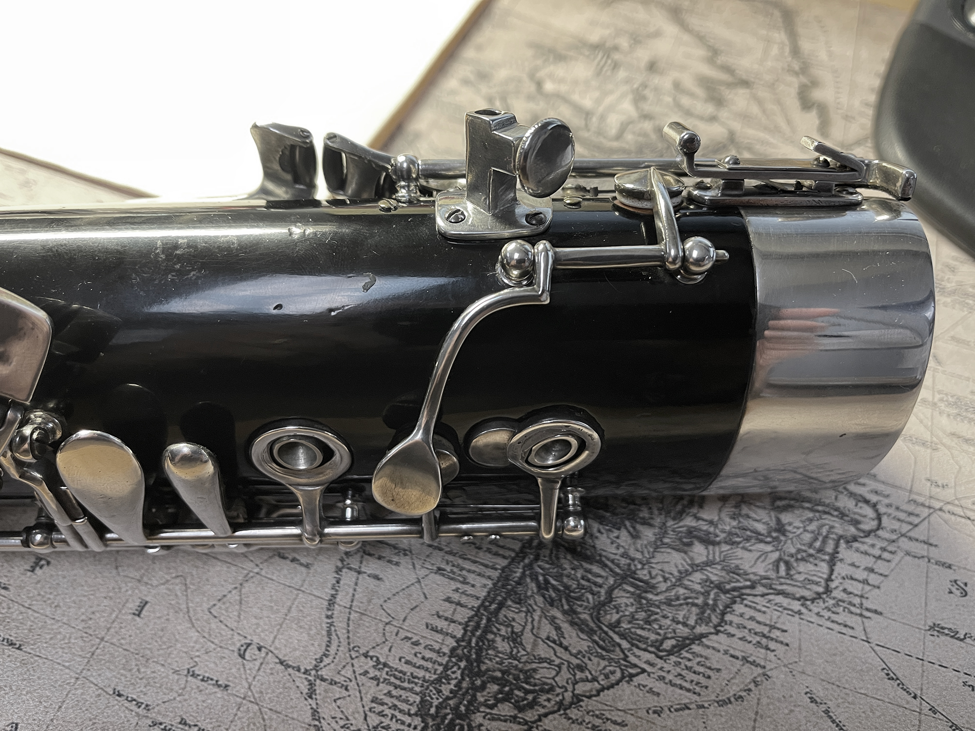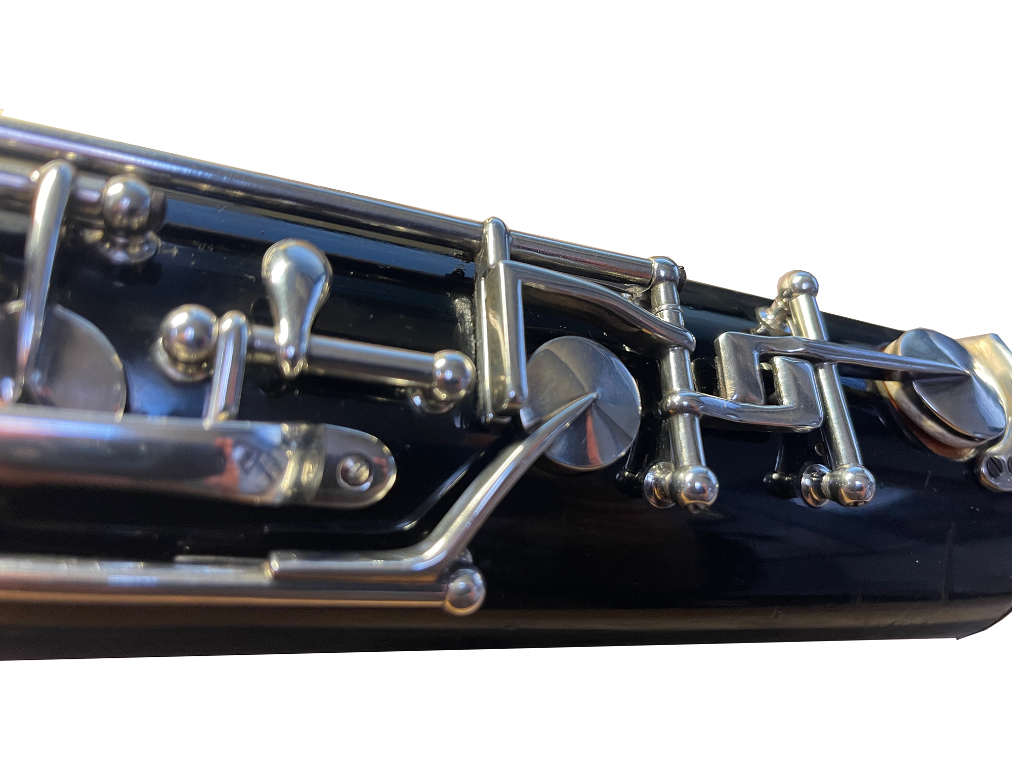This instrument was cared for by Hans Moennig for many decades. It was Moennig who designed and created the custom additional keywork. The instrument was refinished in the original black finish and fully resilvered by James Laslie. The finish and silver keywork are in excellent condition.