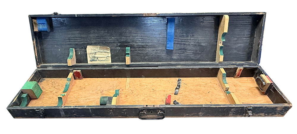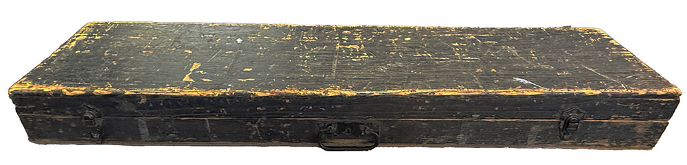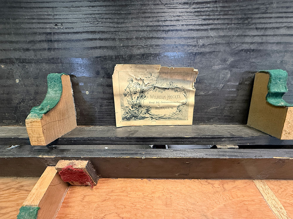 The case is original from 1903. It’s solid wood and heavy and features the original interior Heckel label as shown in the photos. Although the case is quite worn it has good working hinges, clasp latches and a solid, trustworthy solid metal handle. Overall, even though it is over 120 years old, the case is in reliable condition.