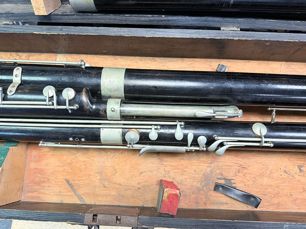 We dusted and did minor cleaning throughout the instrument, oiled the keywork, replaced some pads, and adjusted the current pads to a degree, though it still has leaks. In addition, we sealed some of the areas around the U tubes, recorked the removable bell and play tested it.