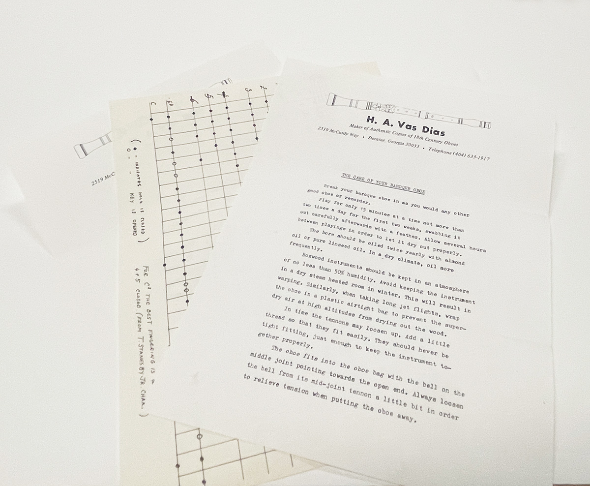 This brand new H.A. Vas Dias baroque oboe is an exact reproduction of one made by Jacob Denner (Nurnberg MIR 370). It’s a gorgeous work of art and an easy playing instrument. This oboe is supplied with a handmade Vas Dias reed and bottom staple which was made for this instrument. It is pitched at A=415.