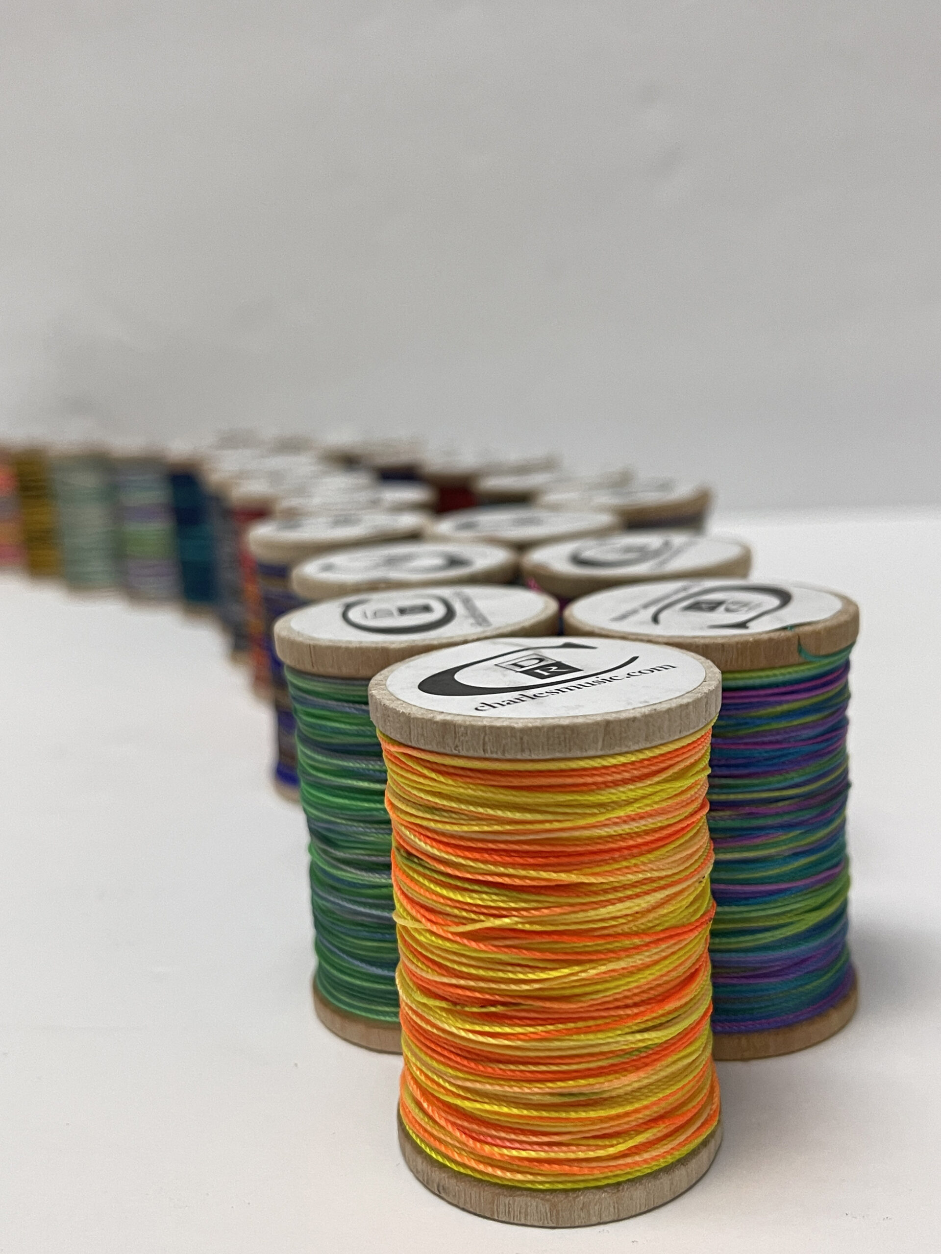This premium quality hand-dyed, uncoated FF nylon thread is wound onto classic, double-sided wooden spools. Double-sided spools stop the thread from bunching up or coming off one side of the spool as you wrap your reed. The notch on the edge of the spool is there to allow you to secure the thread for storage.